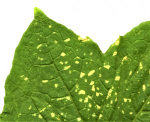 Biele až striebristé bodky, ktoré neskôr žltnú a uschýnajú. Na spodnej strane listov pavučinový povlak.